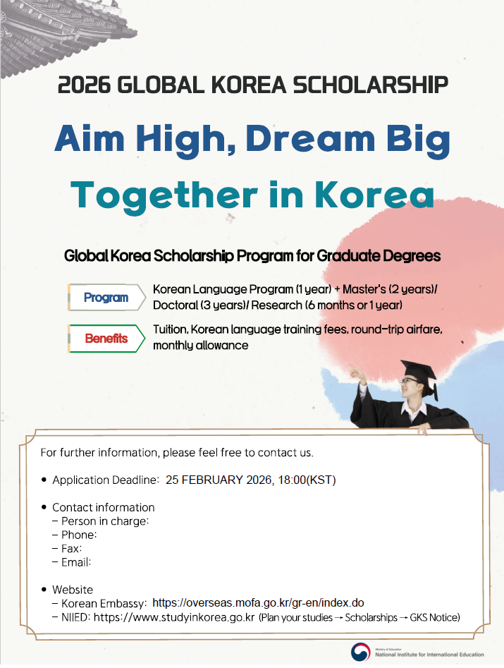 Please find enclosed information on 2026 Global Korea Scholarship (GKS) for Graduates, which is the scholarship program from the Korean National Institute for International Education (NIIED) under Korean Ministry of Education.
